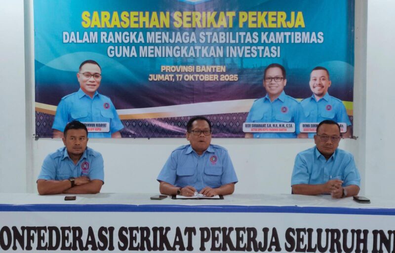 Tangerang,Klikberita.com -Dalam upaya terus menjaga stabilitas Kamtibmas dan untuk meningkatkan investasi, Dewan Pimpinan Daerah Konfederasi Serikat Pekerja Seluruh Indonesia ( DPD KSPSI ) Provinsi Banten mengelar Sarasehan serikat pekerja di Aula Kantor SPSI, Cikokol ,Kota Tangerang, Jum’at (17/10/2025)
