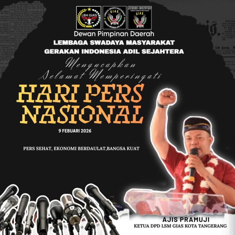 “Atas nama keluarga besar LSM GIAS DPD Kota Tangerang, saya mengucapkan Selamat Hari Pers Nasional 2026. Pers yang profesional, independen, dan berintegritas merupakan mitra strategis masyarakat sipil dalam mengawal pemerintahan yang bersih, transparan, dan akuntabel,” ujar Ajis Pramuji.